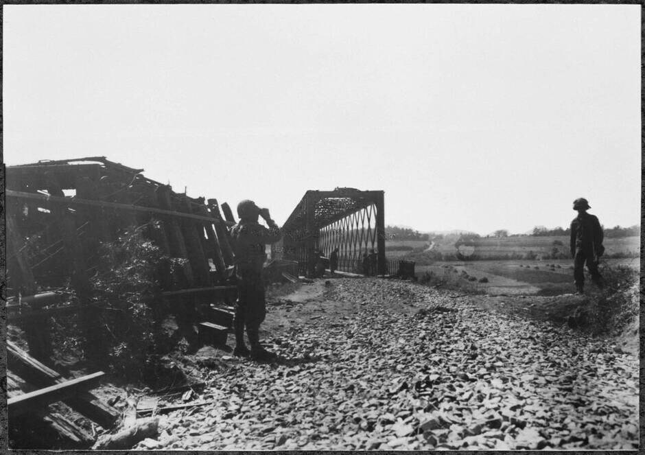 Dans la soirée, malgré un wagon qui avait été renversé en travers de la voie, le dimanche précédent, pour fermer l'entrée du pont du côté de Pruniers, les sapeurs américains commencèrent à enlever les rails de la ligne depuis la route jusqu'au pont à l'aide d'une machine spéciale. Ils posèrent ensuite des madriers sur les rails du pont pour permettre le passage des chars.